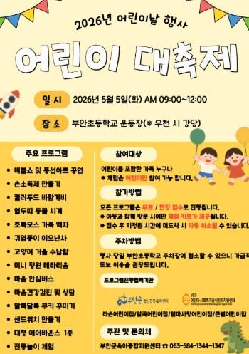 [경남도민뉴스=최인태 기자] 부안군육아종합지원센터는 오는 5월 5일 오전 9시부터 12시까지 부안초등학교 운동장에서 ‘어린이 대축제’를 개최한다고 밝혔다.