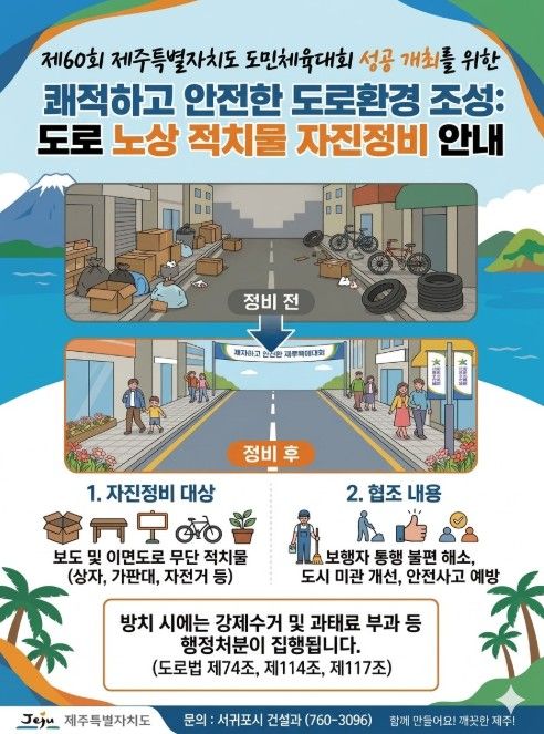 [경남도민뉴스=하형수 기자] 서귀포시는 2026년 개최되는 4개 주요 체전에 대비하여 방문객과 시민들에게 안전하고 쾌적한 도로 환경을 제공하기 위해 ‘노상적치물 집중 정비’를 본격 추진한다고 밝혔다.