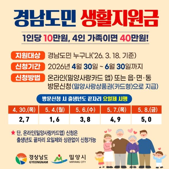 [경남도민뉴스=나희준 기자] 경남 밀양시는 오는 4월 30일부터 시민 생활 안정을 지원하기 위한 ‘경남도민 생활지원금’ 신청을 받는다고 밝혔다.
