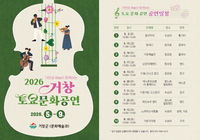 공연은 5월 2일 ‘음치박치’의 통기타 공연을 시작으로 9월 19일 ‘거창국악원’의 국악 공연까지 총 10회에 걸쳐 이어진다. 국악, 클래식, 밴드, 통기타 등 다양한 장르의 공연이 매회 60분 동안 펼쳐지며, 야외 공간과 어우러진 생동감 있는 무대를 선사할 예정이다.