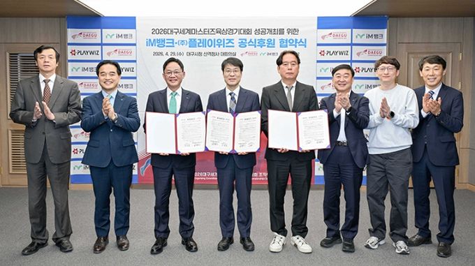 [경남도민뉴스=백상현 기자] 2026대구세계마스터즈육상경기대회 조직위원회는 4월 29일 시청 산격청사에서 iM뱅크 및 ㈜플레이위즈와 대회 공식 후원협약을 체결했다.