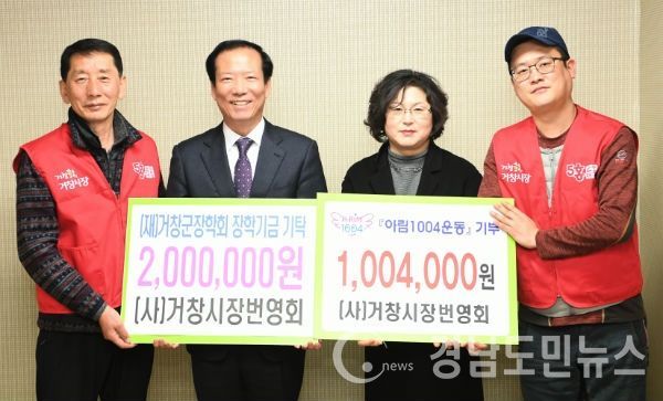거창시장번영회(회장 이정용)는 매년 거창군장학회 장학금 기탁, 아림1004운동 참여 등 사회공헌활동을 적극적으로 실천해 왔으며, 올해에는 거창군장학회에 2,000천 원, 아림1004운동에 1,004천 원을 기탁했다.