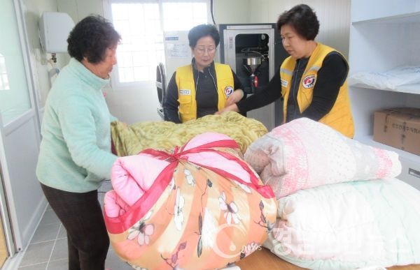 첫날 가조면 적십자봉사회원들이 석강리 생초마을 외 2개소를 방문하여 세탁이 필요한 이불과 의류 등을 아침 일찍 수거하여 본격 가동했다. 한번 세탁 시 이불 4채를 세탁 할 수 있는 대용량 세탁기로 세탁에서 건조까지 2시간이면 세탁이 완료된다.
