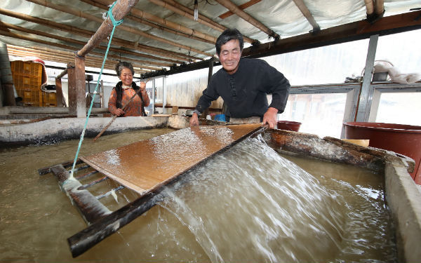 완연한 봄날씨를 보인 4일 경남 함양군 마천면 창원마을에서 ‘지리산 닥종이’ 보존·계승자인 이상옥(73)씨가 4대째 전통방식으로 닥종이를 만들고 있다.