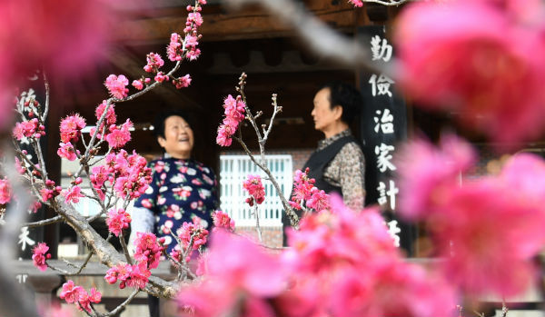 7일 경남 거창군 남하면 산포리 사모정 정자위에서 동네 아낙들이 활짝 핀 홍매화를 바라보고 있다.