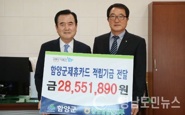 (경남도민뉴스) = 함양군은 14일 오전 군수실에서 서춘수 함양군수, 김우식 NH농협 함양군지부장이 참석한 가운데 함양군 제휴카드 적립기금 전달식을 가졌다.