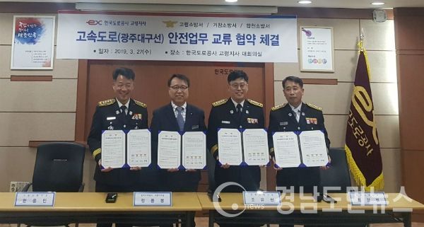 (경남도민뉴스) = 거창소방서(서장 한중민)는 지난 27일 한국도로공사 고령지사 대회의실에서 거창소방서장, 합천소방서장, 고령소방서장 및 도로공사 고령지사장 등 18명이 참석한 가운데 ‘고속도로 재난대비 업무협약’을 체결했다.