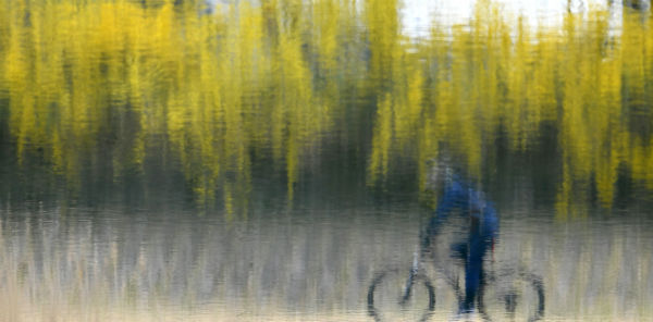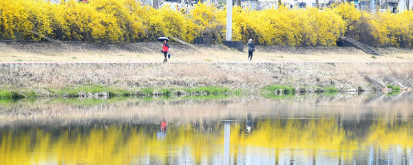 완연한 봄 날씨를 보인 28일 경남 거창군 거창읍을 가로 지르는 위천천 둔치 개나리가 활짝 펴 강변을 노랗게 물들이고 있다.