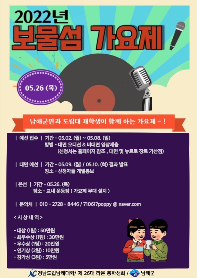 예선은 9일(월) 진행할 예정이다. 예선을 통과한 남해 군민과 남해대학 재학생, 참가자들은 26일(목) 남해대학 운동장에 마련된 축제무대에서 본선 경연을 치르게 된다. 보물섬 가요제 본선 무대 당일에는 지역 출신 예술인들의 축하 이벤트와 졸업생 공연, 초대가수 무대도 예정되어 있다. 참가자들을 위한 푸짐한 경품행사도 준비되어 있다.