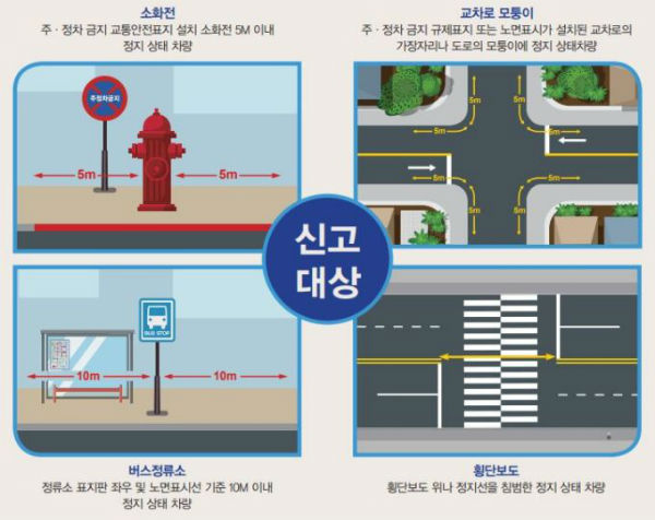 신고대상인 4대 절대 불법 주·정차 금지구역은 ▲소화전 5m 이내 ▲버스정류소 10m 이내 ▲규제표지 또는 노면 표시가 설치된 교차로 모퉁이 5m 이내 ▲횡단보도 및 보도 위에 주차한 차량 등이다. 특히 소화전 5m 이내의 경우 기존 4만 원에서 8만 원으로 상향된 과태료가 부과된다.