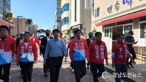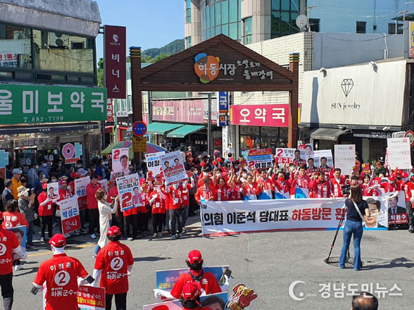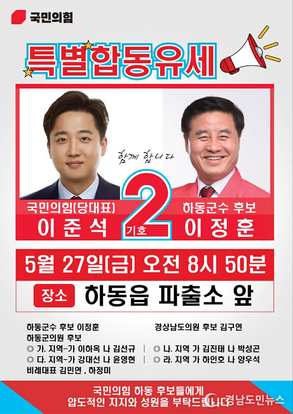 27일 오전 하동읍 파출소 앞에서 개최된 국민의힘 특별합동유세에는 이준석 당대표, 하영제 국회의원, 박완수 경남도지사후보, 이정훈 하동군수후보, 도의원후보, 군의원후보 등이 참석하였고 대규모의 인파가 몰렸다.