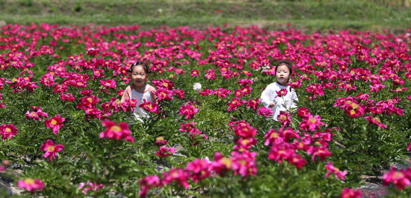 초여름 날씨를 보인 22일 오전 경남 함양군 상림공원 경관단지에서 활짝 핀 작약꽃길을 어린이들이 걷고 있다.