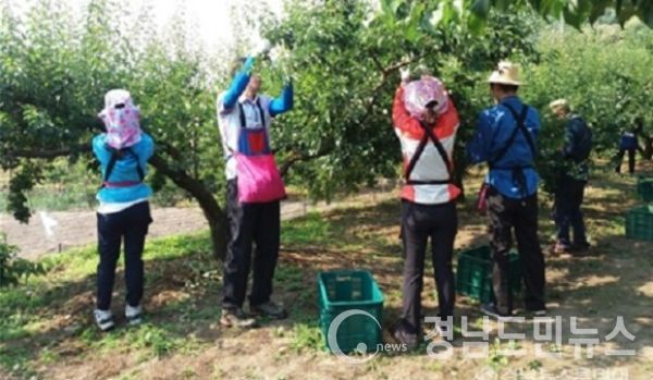 현재 군에는 모내기 4044㏊를 비롯해 매실수확 289㏊, 보리·밀 수확 70㏊, 배 솎기 및 봉지씌우기 205㏊, 콩 파종 250㏊, 마늘수확 38㏊, 감자수확 65㏊, 기타 152㏊ 등 총 5113㏊에 연 5만 6083명의 일손이 필요하지만 농가자체 인력 외에 1230여 명이 부족하다.