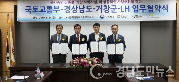 (경남도민뉴스) = 거창군은 지난 24일 국토교통부와 지자체(경상남도, 거창군) 및 한국토지주택공사(LH)가 거창군 거창읍 대평리 공사중단 건축물 정비 선도사업 본격 추진을 위해 업무협약(MOU)을 체결했다고 25일 밝혔다.