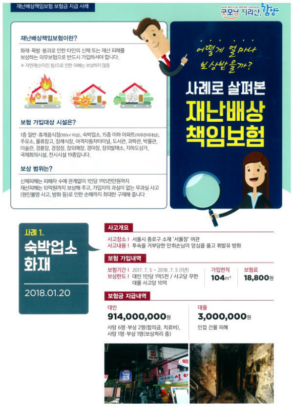 가입대상은 1층 음식점, 숙박시설, 15층 이하 아파트, 물류창고, 장례식장, 주유소, 도서관, 박물관 등 19종 시설이다.