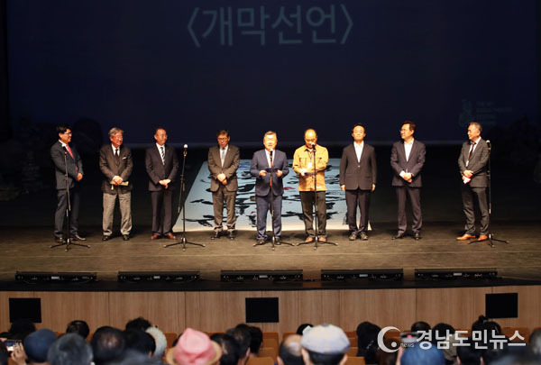 개막 퍼포먼스로 서예가 우제 강봉준 씨가 ‘서예 퍼포먼스’를 선보이며, 두 행사의 성공적 개최를 기원했다. 내빈인사와 개막선언에 이어 경남 연극인들이 준비한 ‘다시, 동지섣달 꽃 본 듯이’라는 제목의 개막 축하공연이 이어졌다.