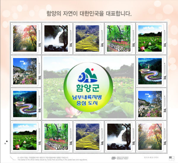 11일 함양우체국에 따르면 최근 발행한 우표 7종은 천년의 숲 함양상림의 가을풍경, 아름다운 연꽃이 핀 모습, 화사한 꽃무릇의 상림, 신비한 느낌을 주는 용추폭포, 정자문화의 진수 거연정, 꼬불꼬불 명풍경 지안재, 마천 다랭이논 등이다.
