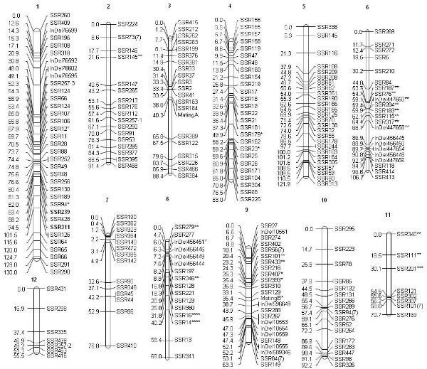 | 새송이버섯의 유전지도는 256개의 마커를 가진 12개의 연관집단 농업적으로 가장 중요한 형질인 갓색, 수량, 품질 등과 연관된 마커가 48개 밝혀졌다. |