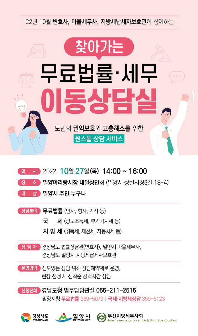 [경남도민뉴스] 경상남도(도지사 박완수)는 오는 27일 오후 2시부터 4시까지 밀양시 아리랑시장 내일상인회에서 ‘찾아가는 무료법률·세무 이동상담실’을 운영한다고 밝혔다.