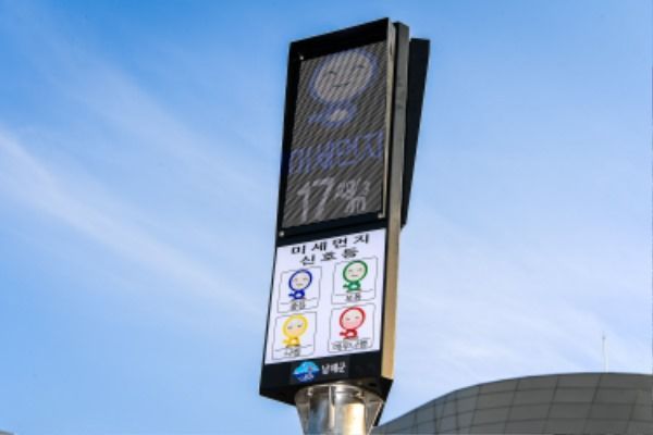 미세먼지 신호등은 남해유배문학관에 설치된 대기오염측정소의 미세먼지 측정결과 데이터를 실시간으로 전송받아 미세먼지 농도에 따라 파랑, 초록, 노랑, 빨강으로 표출되어 남녀노소 누구나 한눈에 알아볼 수 있다.