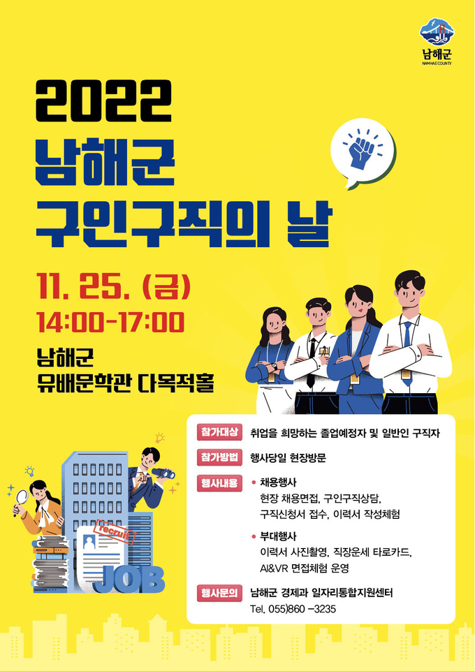 또한 경남여성새로일하기센터, 남해군시니어클럽, 하동고용센터에서도 참가해 구직상담 및 사업을 홍보할 예정이다. 남해군 일자리통합지원센터는 공공근로, 지역일자리, 노인일자리, 청년일자리 등 유형별 일자리사업을 직접 홍보하고 이력서 작성체험, AI&VR 면접 체험부스를 운영할 예정이다.