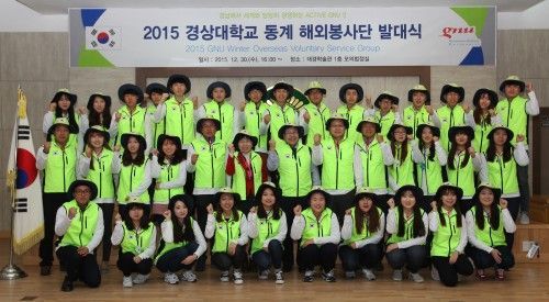 경상대학교(G경NUㆍ총장 직무대리 정병훈)는 지난 30일 대경학술관 모의법정에서 정병훈 총장 직무대리, 최정혜 해외봉사단장, 학생 봉사단원, 교직원 등 40여 명이 참석한 가운데 2015년 동계 해외봉사단 발대식을 개최했다.