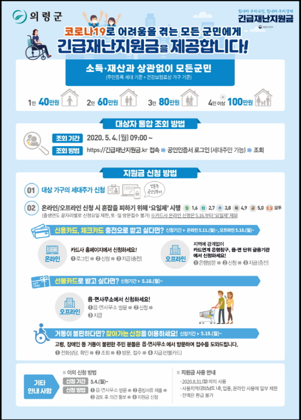 가구당 최대 100만원씩 주는 정부 긴급재난지원금은 5월 11일부터 카드사 홈페이지에 신용·체크카드 온라인 신청으로 지급된다. 5월 18일부터는 지역에 관계없이 카드와 연계된 은행창구나 읍·면 단위 금융기관, 그리고 읍·면사무소에서 오프라인 신청이 가능하다.