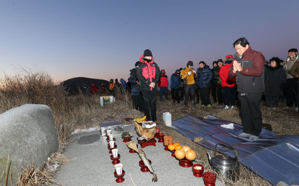 1일 오전 새해 해맞이 행사가 열린 산청군 차황면 황매산 정상제단에서 허기도군수와 정명순부의장을 비롯한 200여명의 참가자 들이 병신년 첫 일출을 바라보며 저마다 소원을 빌고 있다.