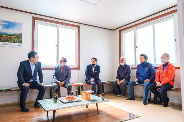 - 사진은 지난 19일 오후 편의시설이 설치된 서면 도산마을 경로당을 방문한 장충남 남해군수(왼쪽).
