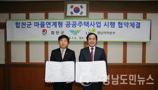 합천군(군수 하창환)과 한국토지주택공사(경남지역본부장 소병로)는 합천군 마을연계형 소규모 공공임대주택사업의 원활한 추진과 상호협력을 위한 시행협약을 지난 6일 합천군 회의실에서 체결했다.