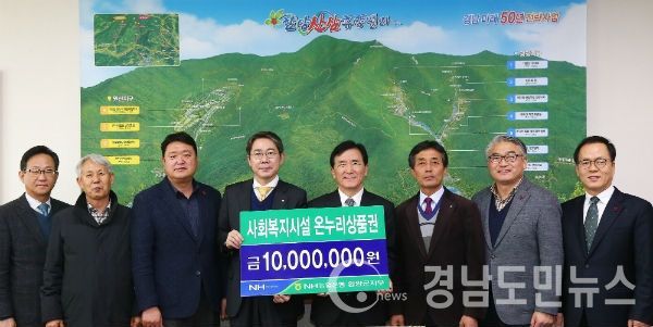 어려운 이웃을 위한 ‘2016년 나눔캠페인’이 활발히 진행되는 가운데 NH농협은행 함양군지부 여일구 군지부장, 지역조합장 등이 6일 오후 군청을 찾아 1000만원 상당의 전통시장 상품권을 기탁해 훈훈한 지역사랑의 정을 실천했다.