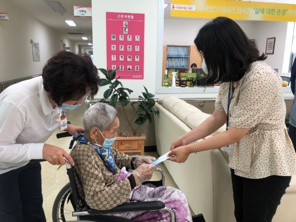※사진설명: 지난 25일 장마면 맞춤형복지팀이 부곡 수다리 요양원을 방문해 저소득층한시생활지원 상품권을 배부하고 있다.