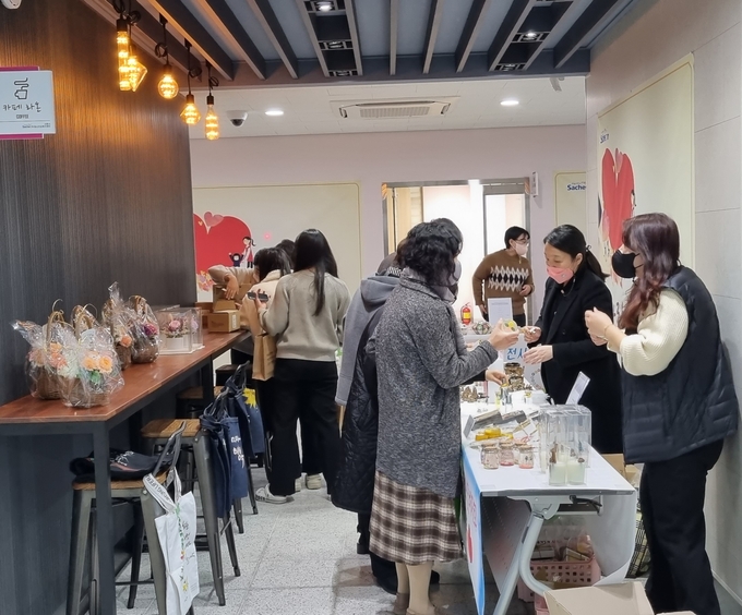 이날 사천시정신건강복지센터 등록회원 20여 명은 사회 복귀 및 재활을 목표로 일상생활 훈련 및 사회 기능 능력을 함양하기 위해 만든 작품을 전시·판매했다.