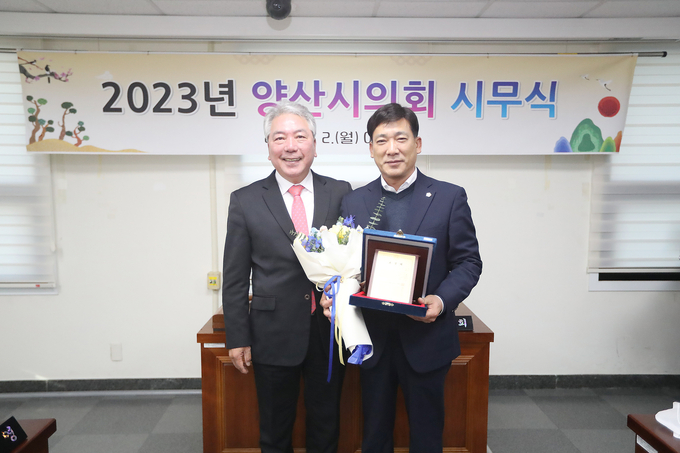 [경남도민뉴스] 양산시의회 김판조, 이묘배 의원이 경남시군의회의장협의회에서 수여하는 의정활동 우수 의원으로 선정되어 2일 시의회 특별위원회실에서 열린 시무식에서 표창패를 수여 받았다.