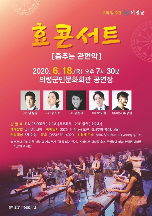 이번 공연은 코로나19로 인한 생활 속 거리두기 [객석 띄어 앉기] 시행으로 객석을 축소 운영함에 따라 관람권 예매를 1인 2매로 제한한다. 기타사항은 의령군민문화회관(☎055-570-4920)으로 문의하면 된다.
