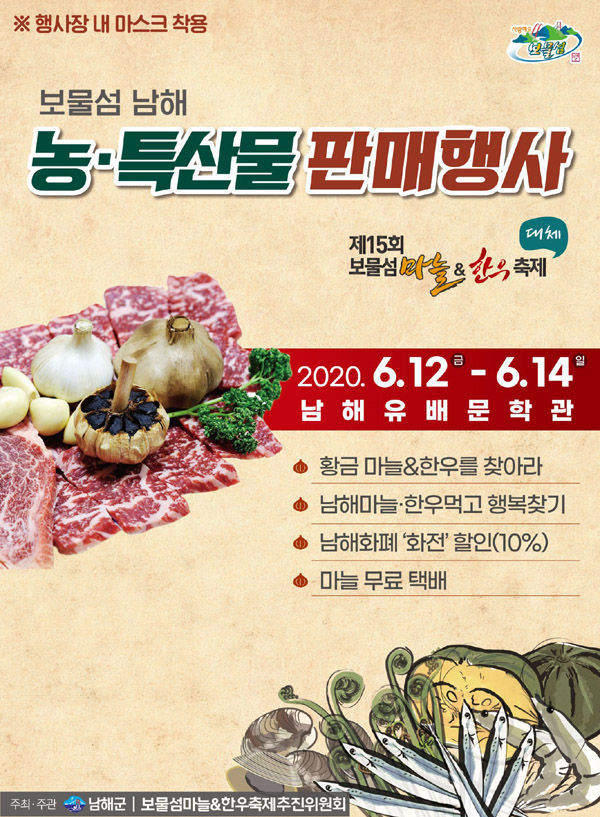 ‘보물섬 마늘&한우축제’를 대체할 이번 판매행사는 해풍 먹은 남해마늘, 청정 남해한우와 함께 흑마늘진액, 멸치액젓 등 가공식품과 바지락, 새우, 단호박, 참다래, 애플수박, 토마토 등 우수 농특산물 판매장도 운영될 예정이다.