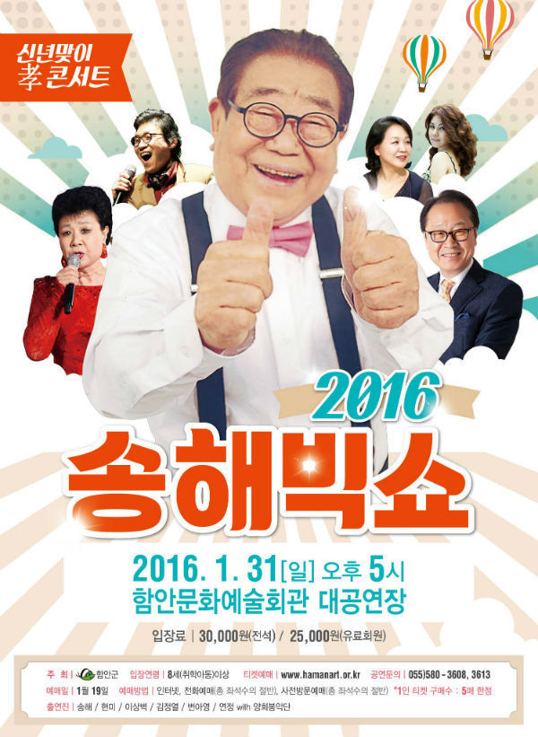 부모님께 드리는 최고의 선물 2016년 신년맞이 효 콘서트 ‘송해 빅쇼’가 오는 31일 오후 5시, 함안문화예술회관 대공연장 무대에 오른다.
