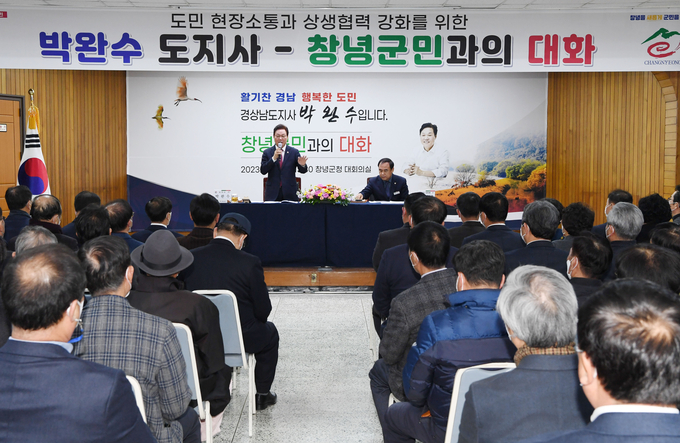 [경남도민뉴스] 박완수 경남도지사가 18일 창녕군을 방문해 군민들의 생생한 목소리를 도정에 반영하고 상생협력의 기반을 다지기 위해 ‘군민과의 대화’시간을 가졌다.