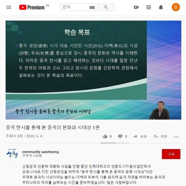 현재 유튜브 채널 ‘community sancheong(https://www.youtube.com/user/sancheonggun/)’에는 ‘중국 한시를 통해 본 중국의 문화 시대상’을 주제로 한 동영상 강연 3편이 업로드 돼 있다.