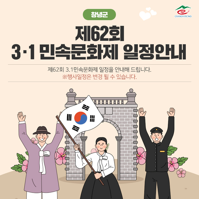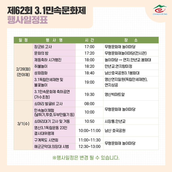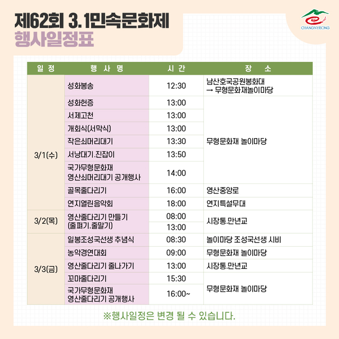 제62회 3.1민속문화제는 2월 28일 전야제로 흥을 돋우고 3월 3일까지 4일간 창녕군 영산면 영산 놀이마당 일원에서 개최할 계획이다.