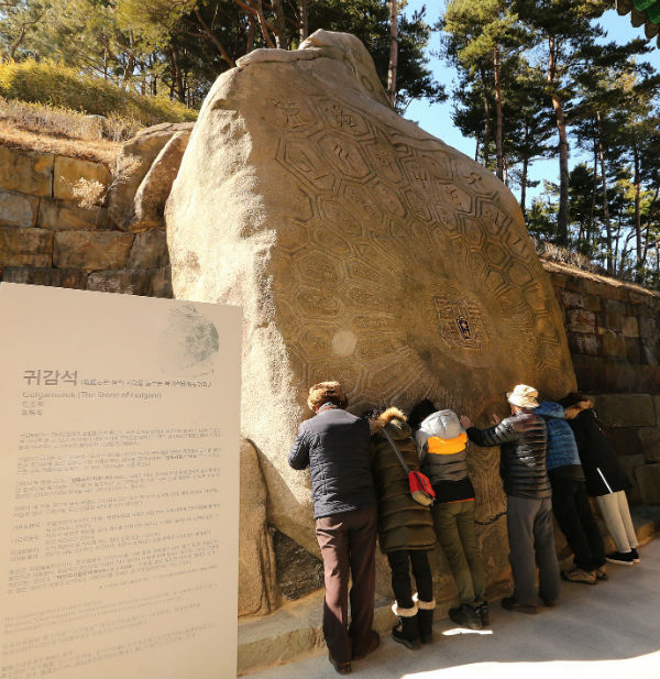 설명절 황금연휴인 9일 산청군 금서면 동의보감촌을 찾은 관광객들과 귀성객들이 동의전 내 귀감석에서 기(氣)체험을 하며 올 한해 좋은일만 생기길 기원하고 있다.