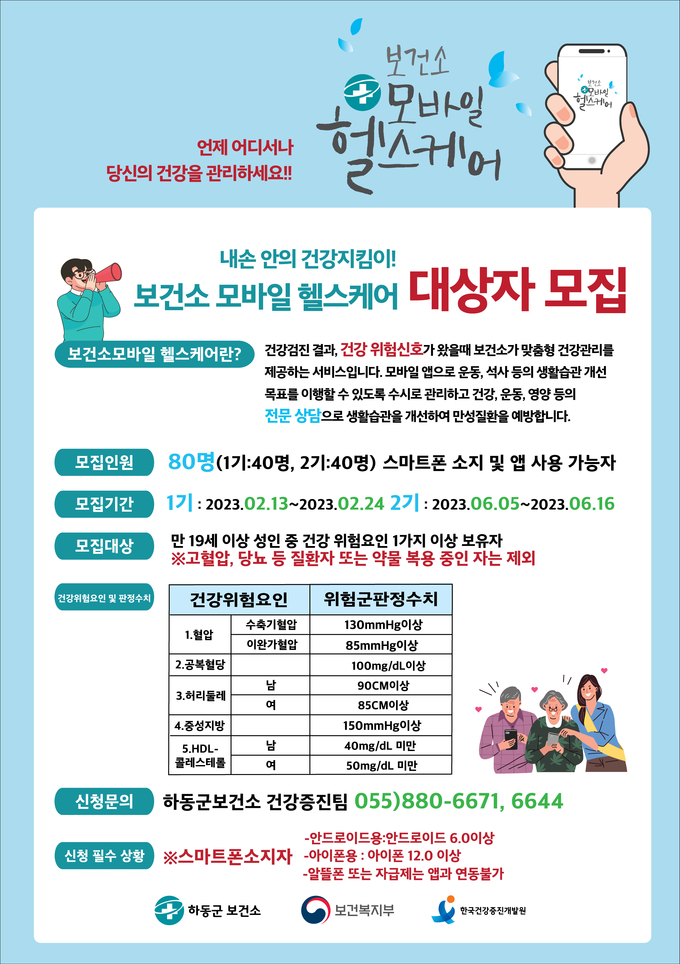 서비스 대상자는 혈압·공복혈당·허리둘레·중성지방·HDL콜레스테롤 등 건강위험요인을 1개 이상 보유한 만 19세 이상 하동군 거주자로 스마트폰을 활용할 수 있어야 한다.