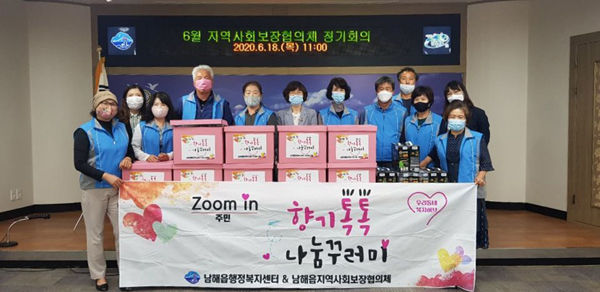 남해군 남해읍지역사회보장협의체(공동위원장 장명정․김민자)는 지난 18일 6월 정기회의를 개최하고 통합서비스 사례관리대상자 9가구에 ‘주민(zoom in)! 향기톡톡 나눔꾸러미’를 전달했다.