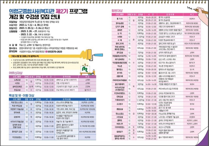 [경남도민뉴스] 의령군(군수 오태완)은 군민들을 대상으로 오는 20일부터 24일까지 2023년 의령군종합사회복지관 제2기 프로그램 수강생을 모집한다.