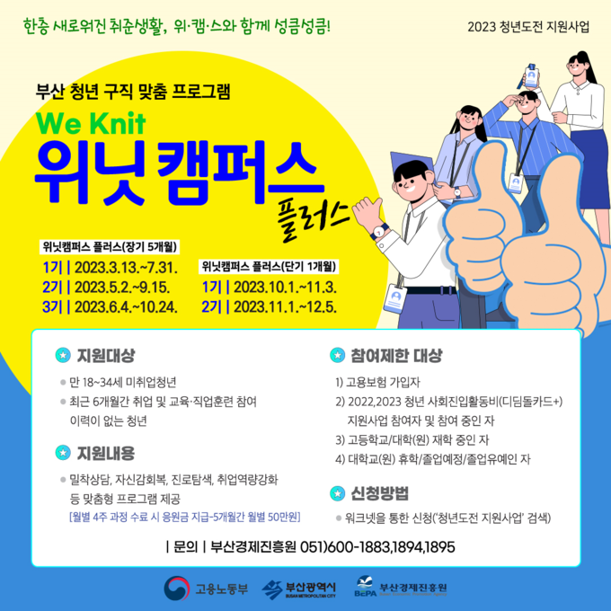 [경남도민뉴스] 부산시(시장 박형준)는 구직활동 중단 등으로 취업에 어려움을 겪고 있는 청년들에게 자신감 고취를 통한 사회 진입 지원을 돕는 ‘2023년 청년도전 지원사업’을 오늘(13일)부터 본격적으로 추진한다고 밝혔다.