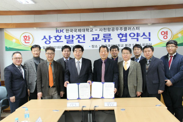 한국국제대학교와 사천항공우주클러스터는 항공국가산업단지 및 뿌리산업특화산업단지 지정 등의 국가기반산업 강화에 대처하기 위한 기업 경영 선진화 및 기술개발, 교육, 연구활동 그리고 지역사회 발전을 선도하기 위하여 산학협정을 체결했다.