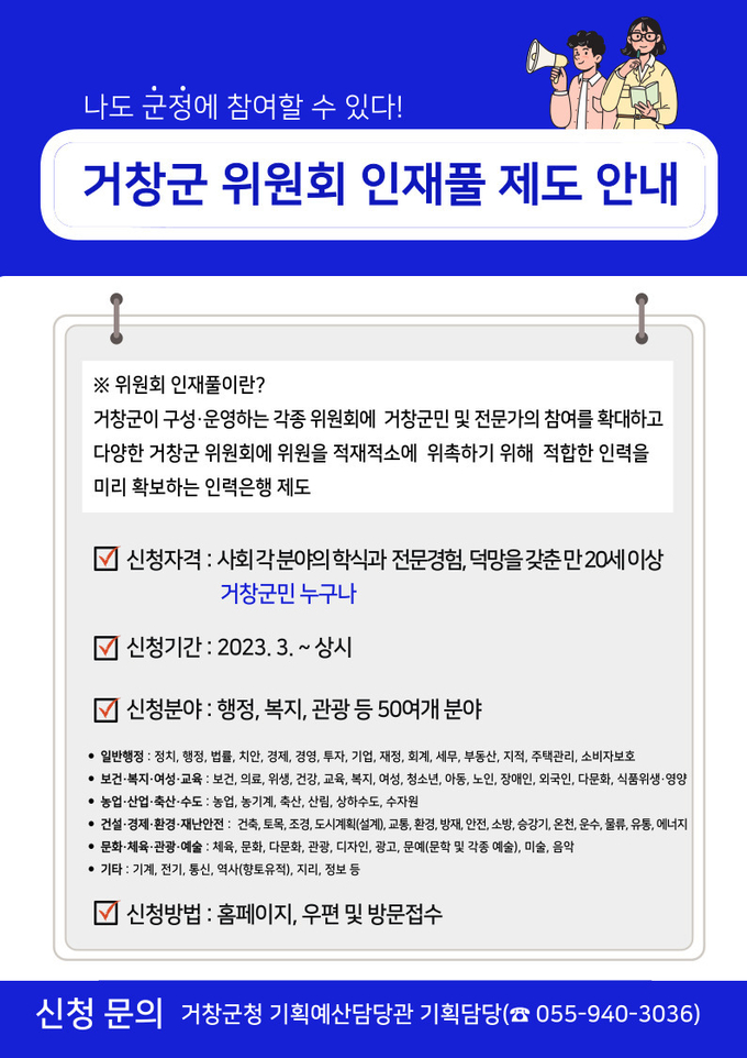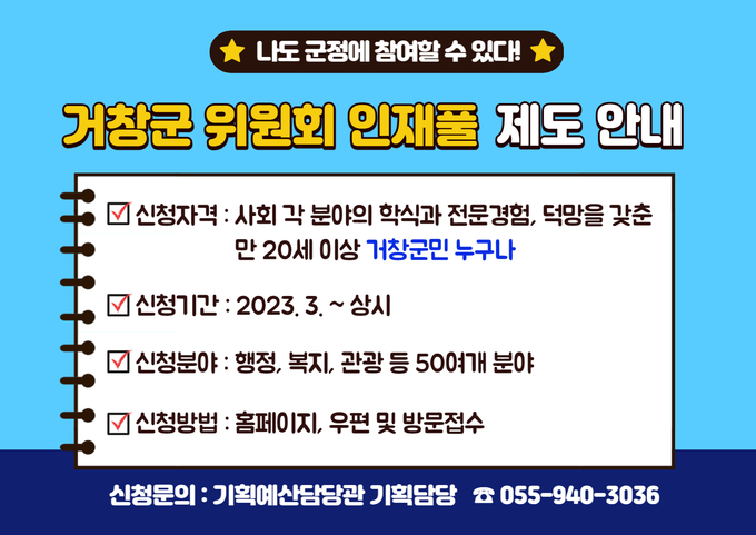 [경남도민뉴스] 거창군은 열린 군정을 실현하고 군민들의 군정 참여 기회를 제공하는 ‘거창군 위원회 인재풀 제도’ 참여자를 상시 모집한다.