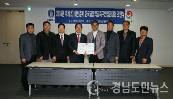 15일 서울 종로구에 위치한 축구회관에서 하창환 합천군수와 정종선 한국고등학교축구연맹 실무부회장을 비롯한 임원 관계자 등이 참석한 가운데 ‘2016~2017년 추·춘계 한국고등학교축구연맹전’ 개최에 대한 협약서를 체결했다.