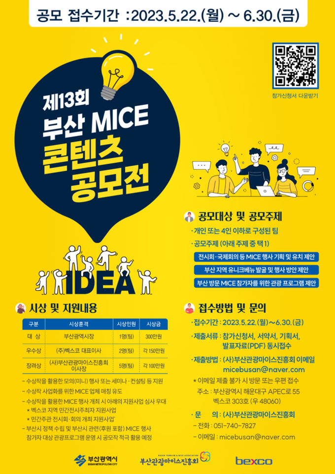 [경남도민뉴스] 부산시(시장 박형준)는 MICE 산업의 저변확대와 지역 경제 활성화를 위한 ‘제13회 부산 MICE 콘텐츠 공모전’을 오는 5월 22일부터 6월 30일까지 개최한다고 밝혔다.