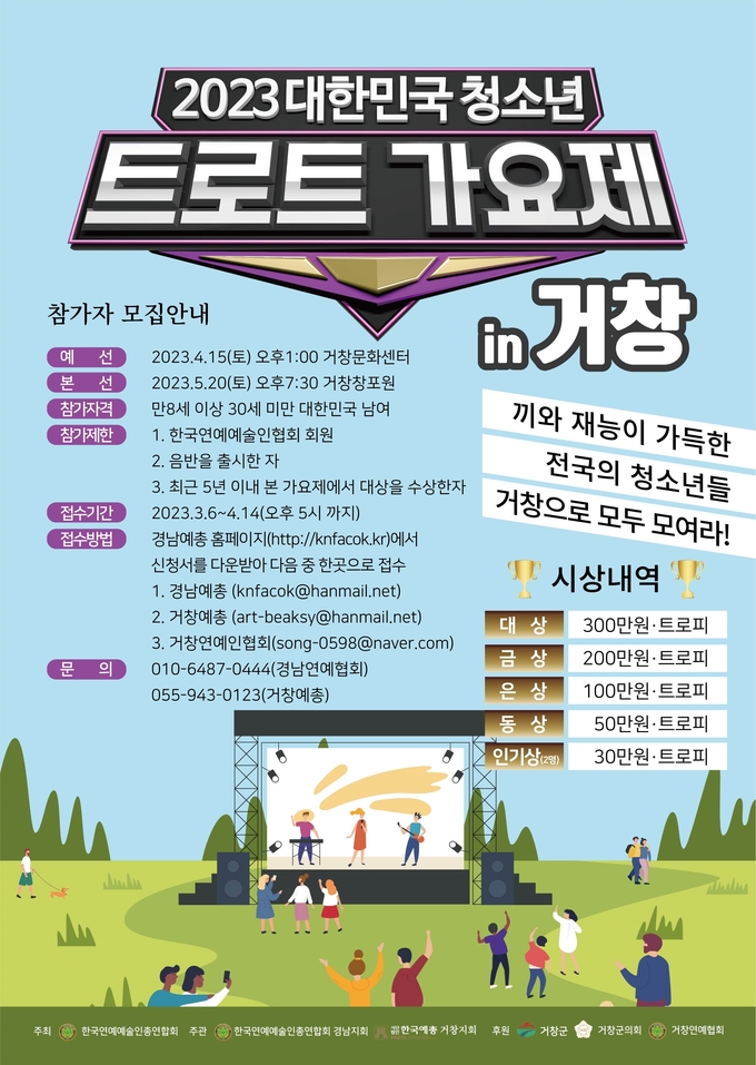만 8세 이상 30세 미만의 노래를 좋아하는 청소년이면 누구나 참가할 수 있으며, 신청은 경남예총 홈페이지에서 신청서를 내려받아 경남예총(knfacok@hanmail.net), 거창예총(art-beaksy@hanmail.net), 거창연예인협회(song-0598@naver.com) 중 한 곳으로 보내면 된다.